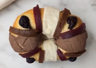 A lightly sweet, enriched yeast bread flavored with fragrant orange zest and anise seeds, shaped with bone-like decorations and dusted in sugar for that classic Día de los Muertos look.