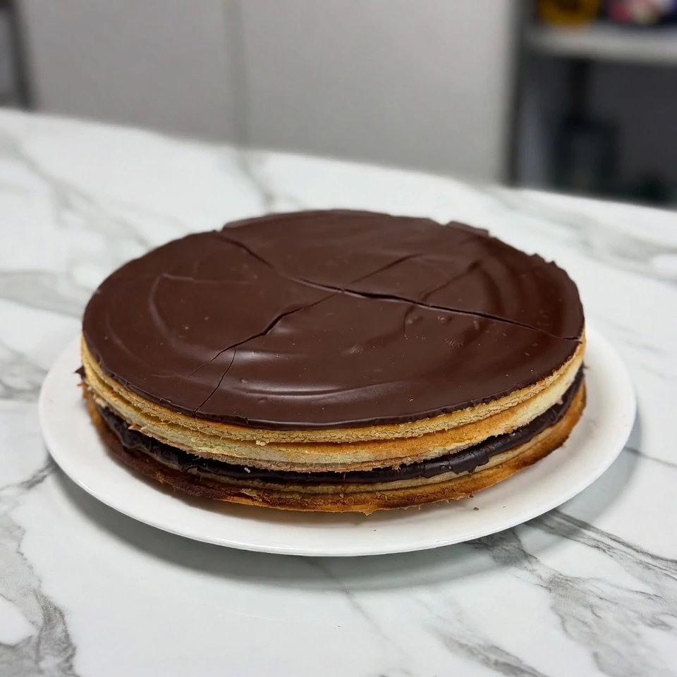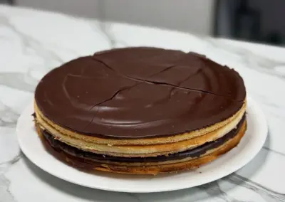 A refined masterpiece of thin almond sponge layers soaked in coffee syrup, alternated with silky chocolate ganache, rich coffee buttercream, and glossy glaze.