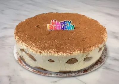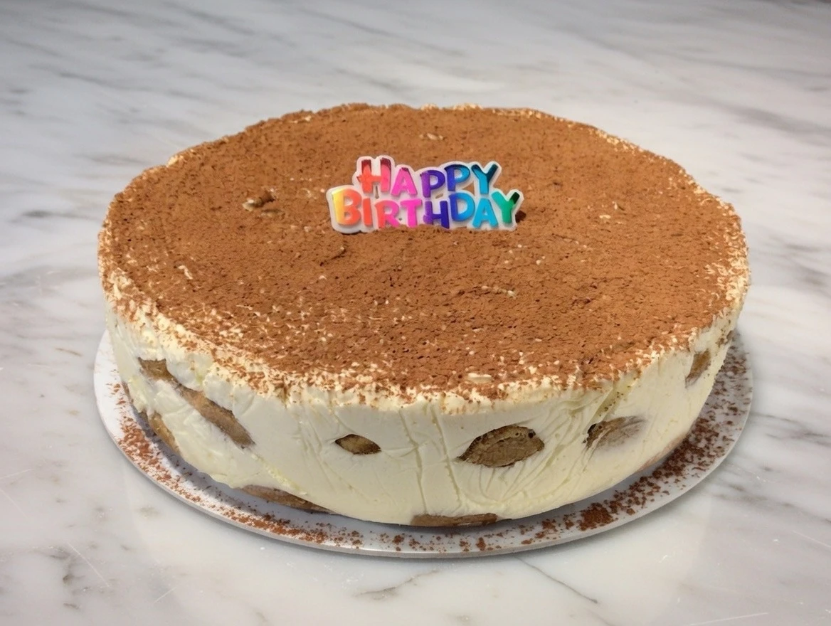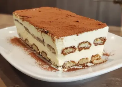 This timeless tiramisu — delicate ladyfingers soaked in rich espresso and rum (or alcohol-free option), layered with velvety mascarpone cream and finished with a generous dusting of cocoa powder.