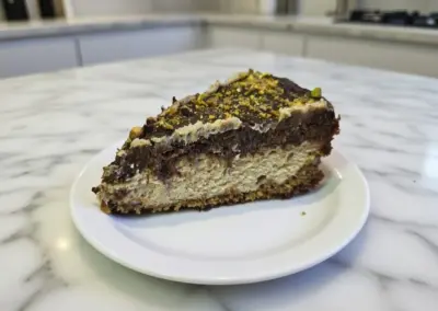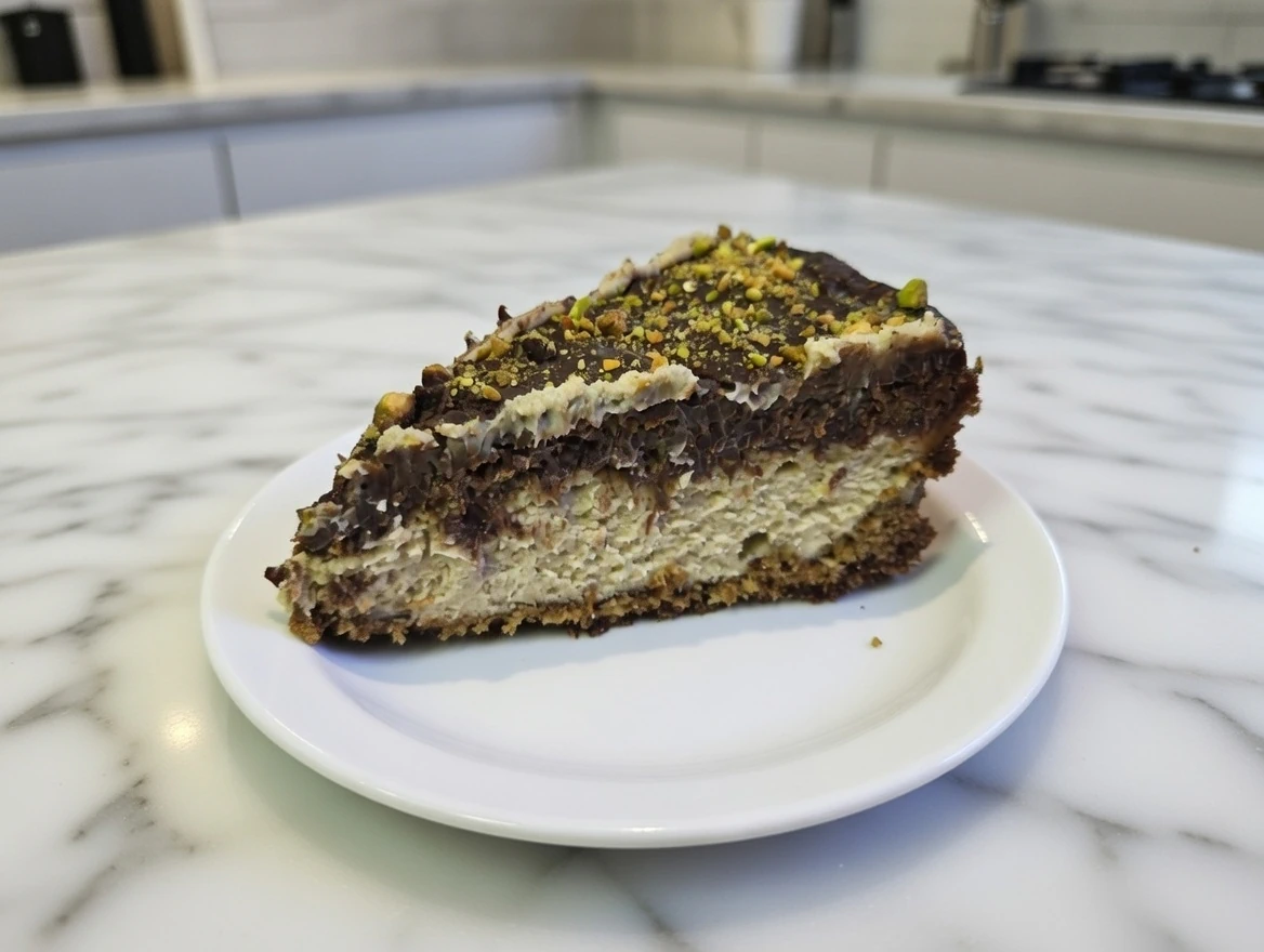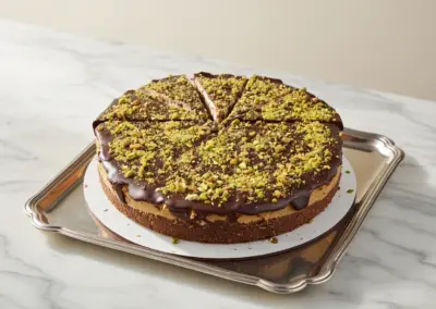 Inspired by the famous viral Dubai chocolate bar, blending creamy pistachio-infused cheesecake with a crunchy kataifi (toasted phyllo) layer mixed with pistachio cream and subtle tahini for irresistible texture, it’s topped with silky chocolate ganache for deep, balanced decadence.