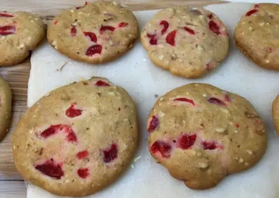 Studded with maraschino cherries for subtle fruity sweetness and vibrant pink-red flecks, they offer a buttery, tender texture that’s perfect for holiday displays or everyday treats.